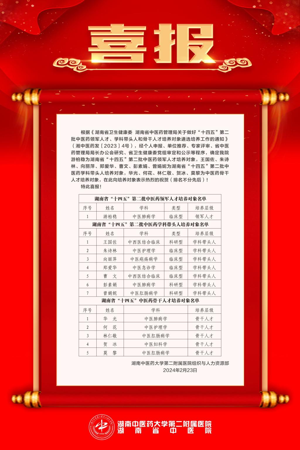 根据《湖南省卫生健康委 湖南省中医药管理局关于做好“十四五”第二批中医药领军人才、学科带头人和骨干人才培养对象遴选培养工作的通知》(湘中医药发〔2023〕4号),经个人申报、单位推荐、专家评审、省中医药管理局局长办公会研究、省卫生健康委党组审定和公示等程序,确定我院游柏稳为湖南省“十四五”第二批中医药领军人才培养对象,王国佐、朱诗林、向丽萍、郑爱华、曹文、彭素娟、曾娟妮为湖南省“十四五”第二批中医药学科带头人培养对象,华光、何花、林仁敬、贺冰、莫黎为中医药骨干人才培养对象,在此向培养对象表示热烈的祝贺(排名不分先后)!