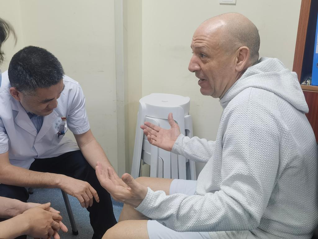 4月28日上午,外国友人Aref Sayegh来我院就医。Aref Sayegh来自瑞士,在长沙工作,3周前因打篮球右膝受伤疼痛,日常行动十分不便。
