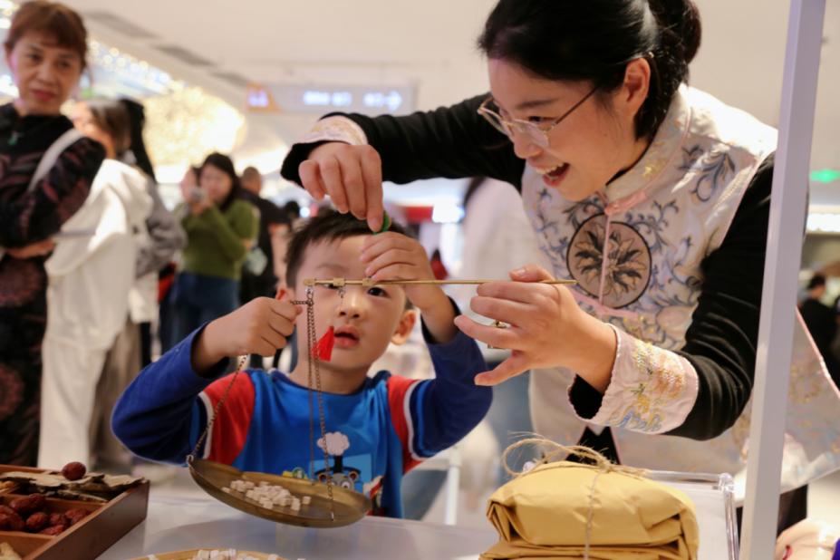 (在中药中药展示专区,一位儿童正在体验中药调剂)