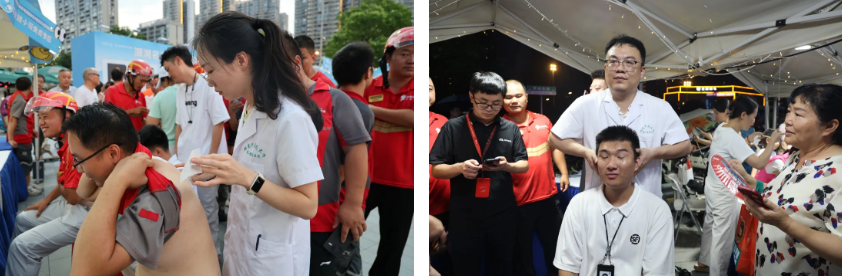 专为“骑士”们开设的免费“三伏贴”专区前排起了长队,热闹非凡。“听说三伏贴能治关节痛,我们风里来雨里去的多少都有点病根,最需要这个!”京东快递小哥张师傅贴上“三伏贴”后连声称赞。“平时跑单太忙了,腰酸背痛也没时间去医院,刚刚医生手把手教了我几个穴位按摩法,舒服又方便,等单时就能做!”饿了么小哥刘群(化名)开心地说。此外,医院派出的心血管内科、呼吸内科、普通外科、骨伤康复科等几大专科及护理专家团队,在夜市“组团”提供暖心贴心的诊疗服务,受到一致好评。