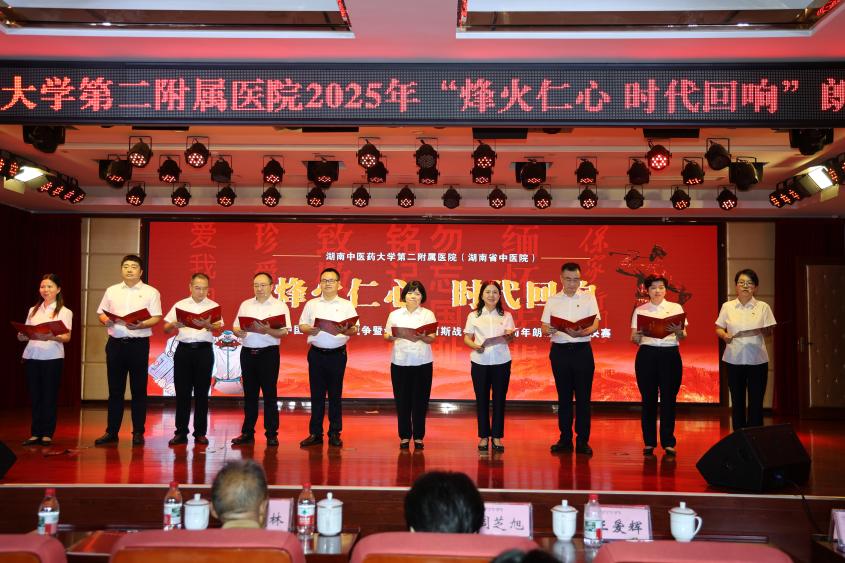 竞演结束后,医院全体党委班子成员共同朗诵《中医附二战队的新时代宣言》,从“站在岳麓之巅,翘首东望”的家园情怀,到“在仲景祠遗址边铸就金字招牌”的默默坚守;从“与救护车为伴、与中医药为伴”的医疗日常,到“把生的机会送到绝望病榻前”的责任担当。他们用真挚的情感,将医院91 年奋斗征程在声浪中铺展,更将“仁爱、精诚、博学、笃行”的精神内核,再次深深镌刻进每一位职工的心底。