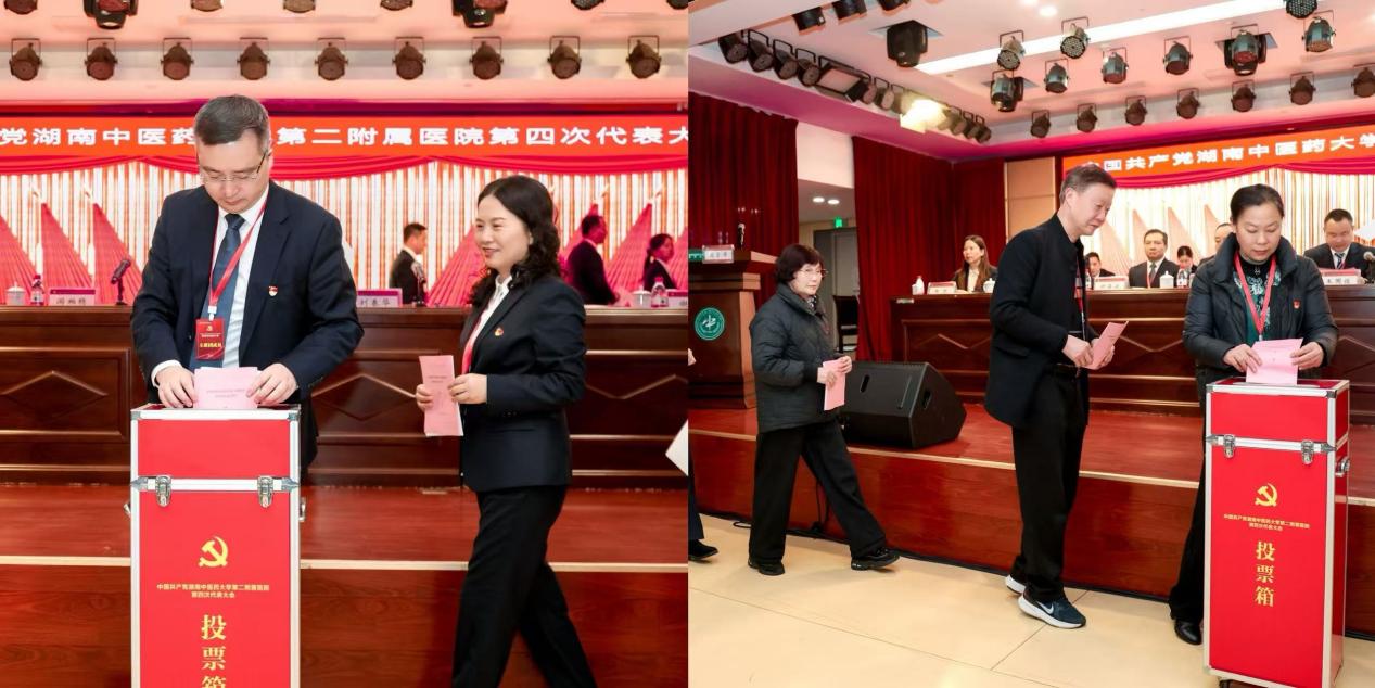 选举大会暨闭幕式上,代表们以无记名投票方式,选举产生了中国共产党湖南中医药大学第二附属医院第四届委员会委员10名(按姓氏笔画排序):王国佐、王爱辉、邓桂明、刘春华、周祎、陶艳、蒋谷芬、游柏稳、谢勇、谢海波;纪律检查委员会委员7名(按姓氏笔画排序):王哲、王爱辉、刘艳红、张晶晶、钟小平、贺霞、廖艳苗。会议审议通过了《关于中国共产党湖南中医药大学第二附属医院第三届委员会工作报告的决议》《关于中国共产党湖南中医药大学第二附属医院第三届纪律检查委员会工作报告的决议》。