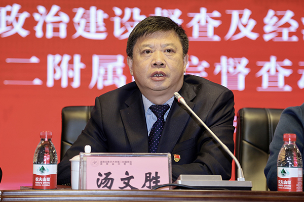 对此次督查工作,汤文胜强调:第一,政治建设督查要和强化“四个意识”、坚定“四个自信”、做到“两个维护”的行动自觉结合起来,第二附属医院党委和各级党员领导干部要以这次督查为契机,全面检视自己,自觉加强政治能力建设,提升思想觉悟,不断提高政治判断力、政治领悟力、政治执行力。第二,政治建设督查要和学习贯彻习近平新时代中国特色社会主义思想主题教育的实际举措结合起来,要引导广大党员干部不断增强自我净化、自我完善、自我革新、自我提高能力,着力解决理论学习不足、政治素质不高、能力本领不强、担当作为不实、工作作风不正、廉洁自律不严问题,把最终能否解决问题作为评判督查成效的重要标准。第三,政治建设督查要和落实全面从严治党政治责任,引领保障校院高质量发展的客观要求结合起来,要加强组织领导,积极支持配合,严肃纪律作风,齐心协力推动政治建设监督顺利完成,取得实效,引领保障学校和医院高质量发展。