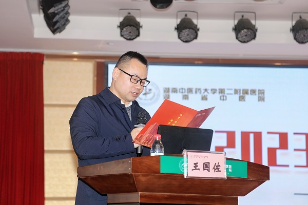 院长王国佐宣读2022年度宣传工作获奖人员名单——金笔丹心奖:何可、王瑞花、邹菊英、陆文洪、汤贞、何花;荧屏之星奖:刘春华、游柏稳、何可、李小莎、熊暑霖、祁双林;爱在指尖奖:兰蓝、廖艳苗、郭维、李佳;最佳通讯员奖:王瑞花、邹菊英、陆文洪。