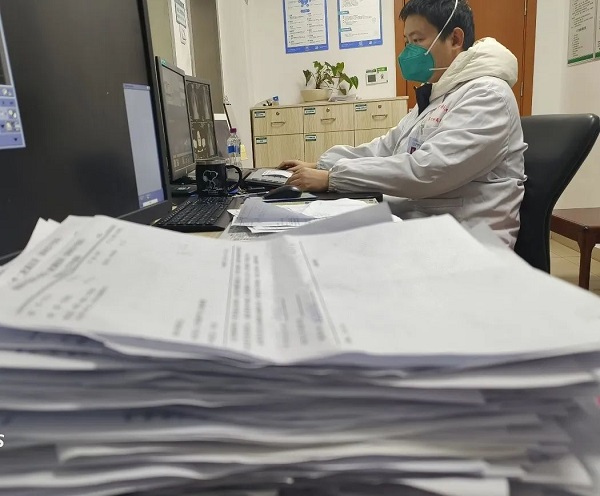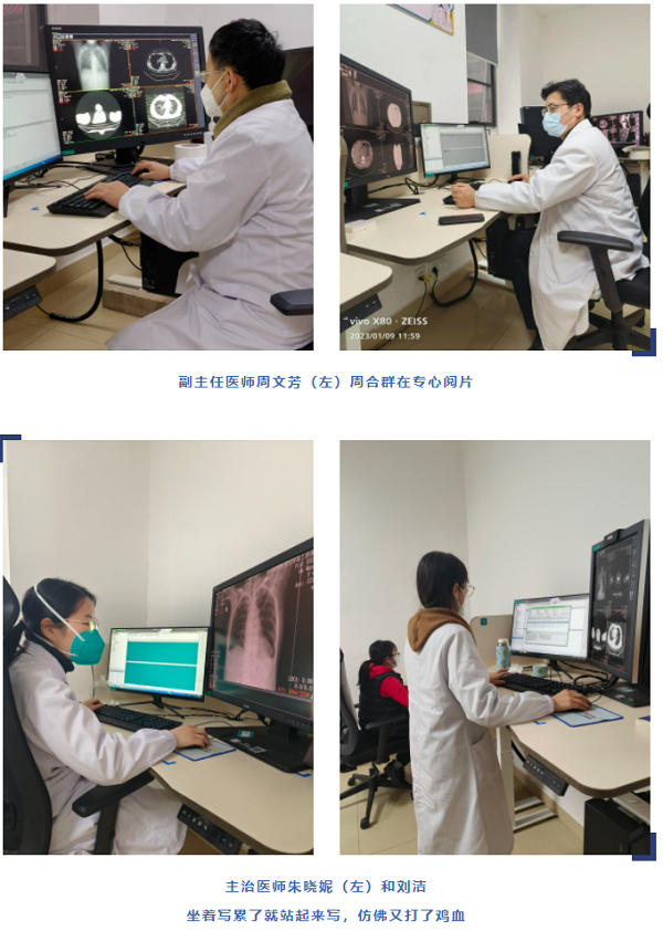 诊断组作为幕后工作者,同样面临着巨大的压力,由于工作量是平时的好几倍,很多医师没痊愈就带病上岗,一阵阵咳嗽声夹杂着键盘的敲击声。