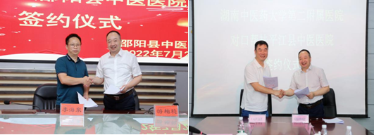 副院长游柏稳带领相关职能部门负责人先后到邵阳县中医医院、平江县中医医院进行了现场调研,在“对口帮扶签约座谈会”上,分别与邵阳县中医医院院长李海泉、平江县中医医院院长卢义明签订《对口帮扶协议书》。游柏稳表示,希望各对口支援医院根据实际情况进一步发展医院的特色优势,大力弘扬中医药特色,走特色兴院之路,同时要做好平台的建设和人才培养引进工作。