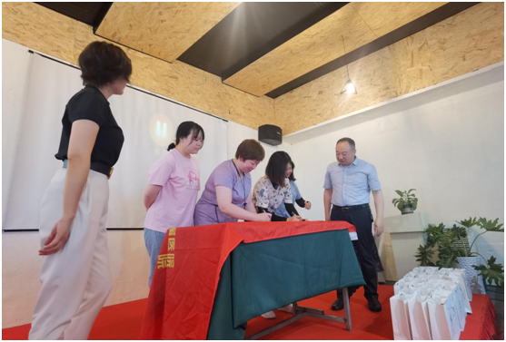 接着,李扬阳宣读湖南省卫健委感谢信。华夏基金会捐赠物资仪式结束后,医疗队全体队员在队旗上签名,并捐赠给医院党委。其后,党委书记杨声辉在讲话中充分肯定了我院援沪援吉同志们的努力与付出,表示在他们身上看到了大爱无疆的抗疫精神,同时对今后大家工作给予鼓励和鞭策,并与所有人一起合影留念。