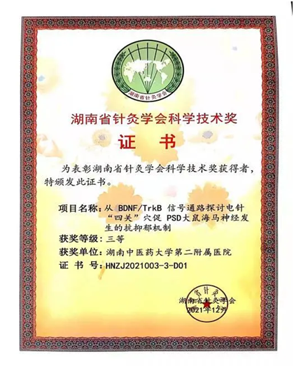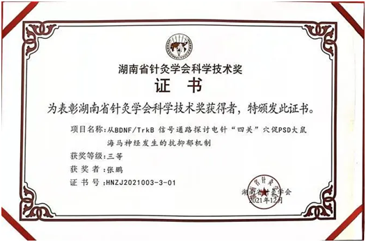 张鹏副教授团队的“从BDNF/TrkB信号通路探讨电针“四关”穴促PSD大鼠海马神经发生的抗抑郁机制”项目荣获科学技术奖(基础类)三等奖。