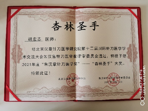 10月13—15日,北京汉章针刀医学研究院第十三届国际针刀医学学术交流大会暨中国中医药研究促进会针刀医学专业委员会2021年会召开。我院骨伤五科(传统康复)主治医师胡宏志应邀参加,并被授予“朱汉章针刀医学奖——杏林圣手”大奖。
