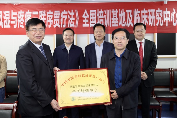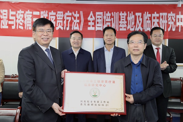 随后,在全体参会人员的见证下,刘良院士将牌匾交至杨声辉手中,湖南省中医院风湿与疼痛三联序贯疗法全国培训基地及临床研究中心正式成立。