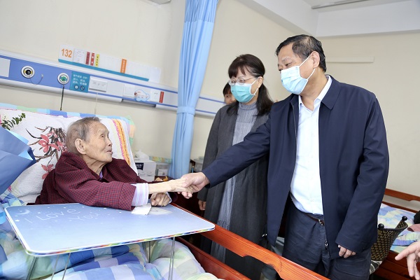 随后,院领导一行来到90岁以上老干部代表——抗美援朝老人谭孝炳老人家中,并前往养老院看望百岁老人黄政闿,向他们致以节日的问候和诚挚的祝福。