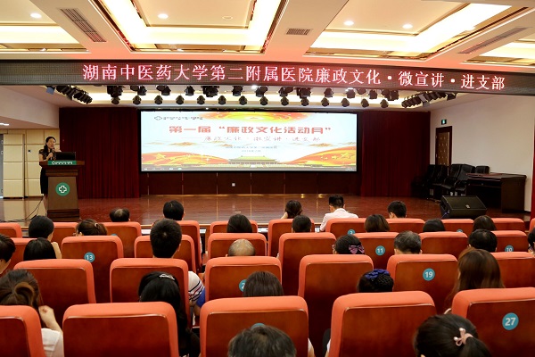 廉政文化进医院,清风徐来沁人心。7月5日下午,医院首届廉政文化活动月——“廉政文化·微宣讲·进支部”活动在外科楼25楼会议厅举行。医院党委书记何永恒、党委副书记、纪委书记焦珞珈、副院长蔡建军,外科党支部、机关党支部、综合党支部、后勤党支部、药剂党支部近200人参加了活动,活动由焦珞珈书记主持。