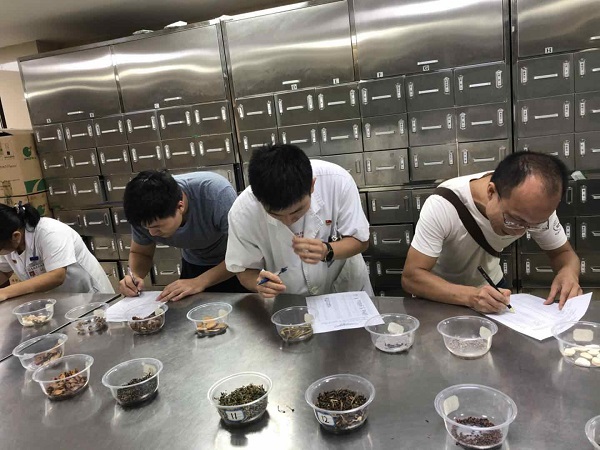 早上8点,选手们完成了一场大题量的理论考试。下午5:30分,实践技能比赛正式开始。实践技能包括调剂操作、中药性状鉴别和中药真伪鉴别等三个竞赛项目。考生们分为三组,在主考老师的带领下轮流进行各项测试。中药调剂环节,选手需在15分钟内,按照处方从摆放的20味中药饮片中,调剂10味*3剂处方中药;中药性状鉴别环节,考生们需在20分钟内,对给出的20味中药材或饮片进行识别,并写出药名与功能主治;中药真伪鉴别环节,选手需在20分钟内,对给出的40味中药材或饮片进行识别,并判断真伪。参赛选手神情专注、沉着冷静,调剂处方有条不紊,药材鉴别观察仔细,展示出了扎实的专业基础知识和娴熟的实践操作技能。