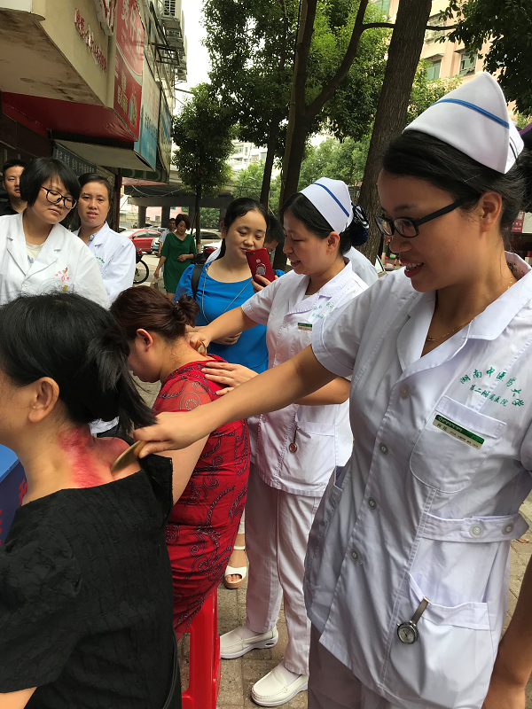 会场的理论课精彩纷呈,与此同时,在怀化市鹤城区红星社区的义诊活动也开展得如火如荼。小小耳穴作用大,周红霞护士长通过简短的问诊辨证,为大家量身制定耳穴贴压方案。刮痧并非雕虫小技,时时可见惊喜,何花护士长手持铜砭,让颈肩痛的群众亲自体验了铜砭刮痧的神奇。除此之外,血糖的检测与指导,悬灸、拔火罐等中医特色技术也深受群众的喜爱。大家分工明确,各司其职,与前来咨询的群众沟通十分融洽,赢得当地居民的称赞。