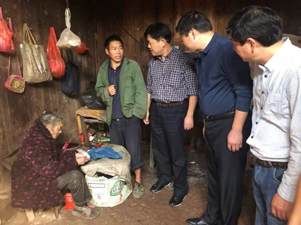 熊辉一行在扶贫工作队和村“两委”的陪同下逐户走访慰问,在蜿蜒曲折的山路旁一幢破烂不堪的土胚房中,我院党委书记何永恒、副院长孙绍裘亲切慰问了蜗居在此的特困户汤千里和他相依为命且患有精神病的母亲,详细询问了他们存在的困难,并鼓励他们要坚定信心,早日脱贫。