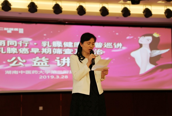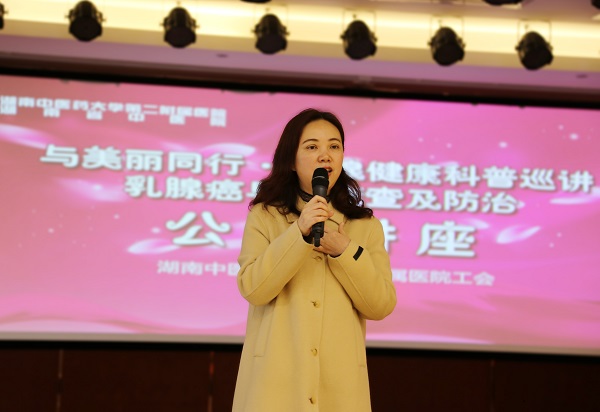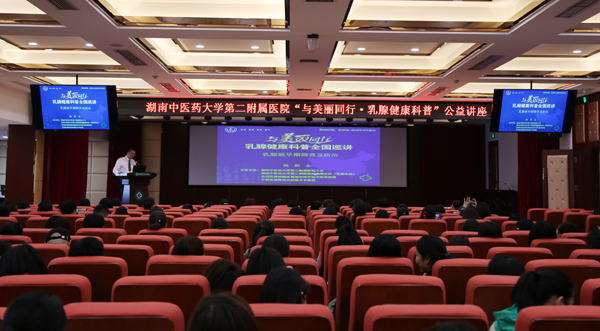 3月28日下午,由我院工会、乳腺外科、中国乳腺微创及腔镜手术联盟联合主办的“乳腺健康科普巡讲.乳腺癌早期筛查及防治”公益讲座在外科楼多功能会议室圆满举行。各兄弟院校工会领导、社区居民、住院病友、医院职工等近两百余人受邀参加。湖南省教育工会女工主任孙晓红莅临现场并致辞,倡议大家共同关注女性健康,提高对乳腺癌的防治意识和防治水平。