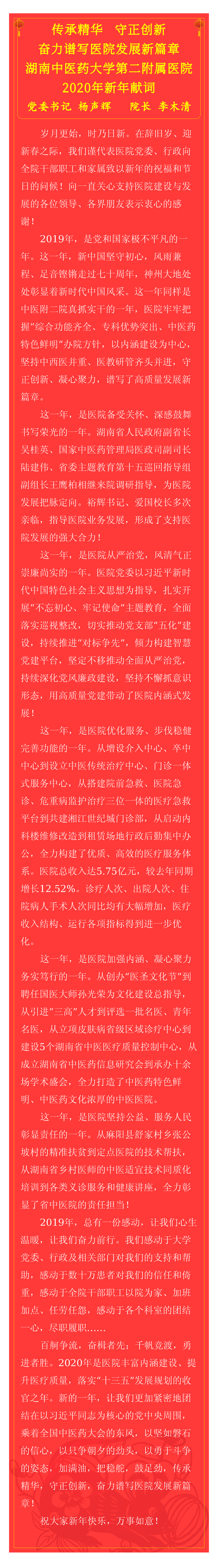 传承精华,守正创新,奋力谱写医院发展新篇章 湖南中医药大学第二附属医院2020年新年献词