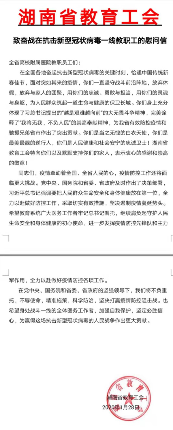 今天,湖南省教育工会向全省高校附属医院教职员工们发来了慰问信,同时也向湖南中医药大学第二附属医院(湖南省中医院)全体抗疫一线职工们发来了慰问信和慰问金,向奋战在抗击新冠疫情的一线职工表示深切的慰问和组织关怀!并鼓励全院职工继续肩负好守护人民生命健康的初心使命,全力以赴做好疫情防控各项工作,为全省及全市疫情防控工作作出应有的贡献!这对全体一线工作者是暖心的关怀,是坚强的后备力量。我们将不负众望,勇往直前!