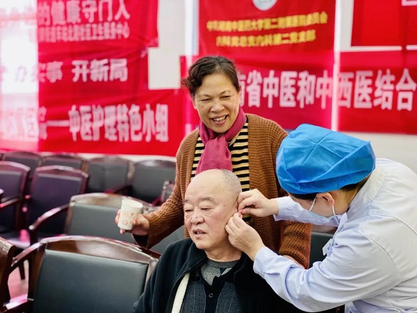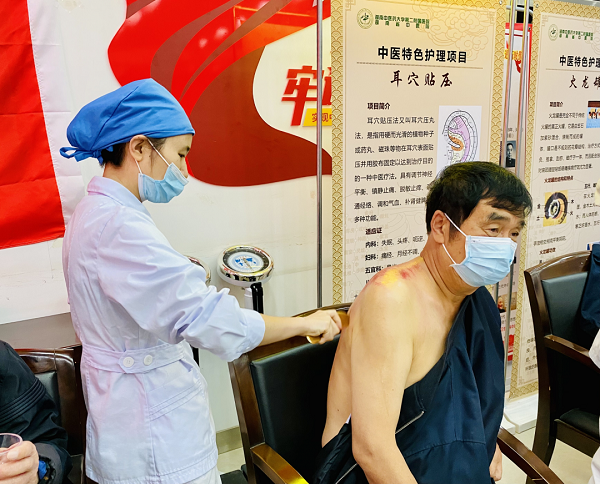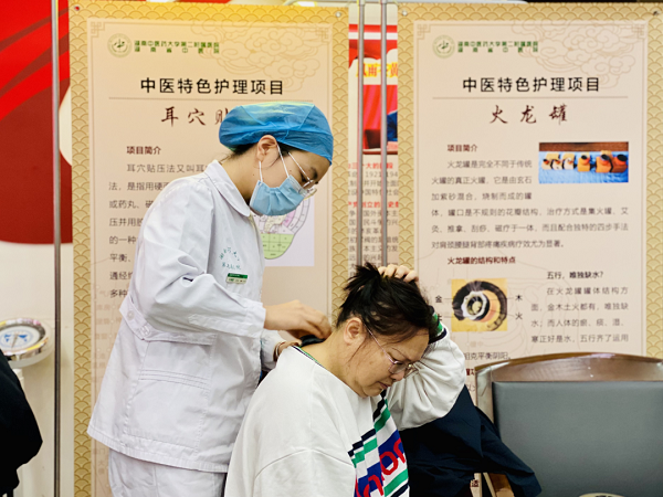 活动现场设立了中医特色护理体验区,为居民们提供耳穴压豆、火龙罐、刮痧等中医特色护理服务。