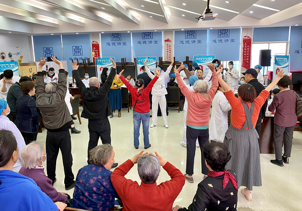 “第一节,双手托天理三焦……”中医养身操八段锦的演示拉开了活动的序幕。居民们兴致勃勃地跟着领操的护士练习起来,一套运动下来,有许多老年朋友还感觉到意犹未尽,纷纷向护士讨教动作要领。