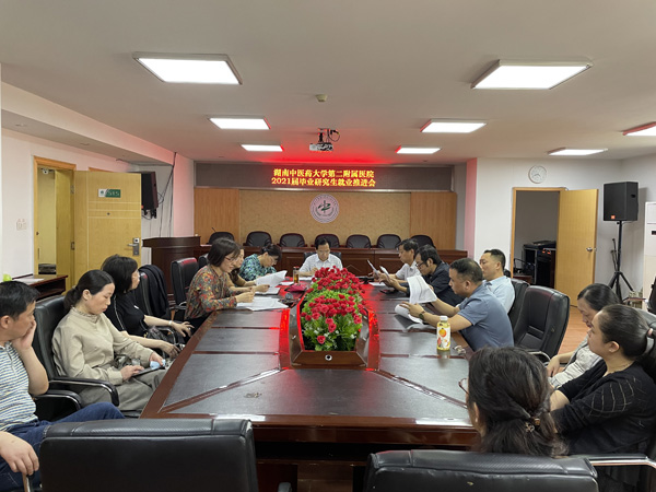 为传达并认真学习湖南中医药大学 2021 届高校毕业生就业工作推进会的会议精神,5月27日下午,我院教务部在汇客五楼会议室组织召开2021届毕业研究生就业工作推进会。医院领导班子全体成员、全体研究生导师、教务部全体成员参加会议。会议由副院长蒋谷芬主持。