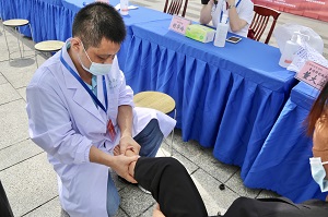 “爷爷,您胃火大、舌苔厚,体内湿气有些重,平时一定要多喝水,多吃蔬菜水果……”上午10点,在义诊活动现场,闻讯而来的群众络绎不绝、排起了长队,来自湖南省中医院儿科、内科、骨科、皮肤科等科室的十多位名医专家们耐心的为每一位群众把脉问诊、答疑解惑,并提出相关的健康指导与建议。不仅如此,现场的医护人员们还为群众提供免费针灸理疗、保健科普、定制中医营养药膳、公益药品派送等服务,并现场教授起了传统保健功法,吸引了很多群众主动参与体验,现场气氛十分热烈。