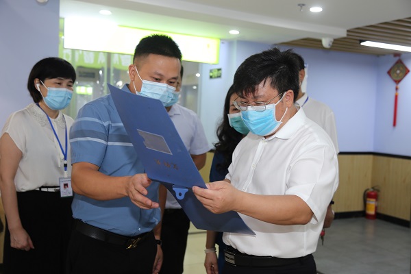 戴爱国一行先后来到门诊楼前坪核酸检测点、发热门诊、门诊大厅、互联网医院预约核酸监测点、食堂、治未病中心、黄码人员核酸采样点等处,现场查看并认真了解发热患者的就诊流程、诊治措施等疫情防控工作及应急物资储备、食堂管理、卫生检疫、通风消毒等情况,并听取院长李木清和相关科室负责人对我院疫情防控工作开展情况的认真汇报。