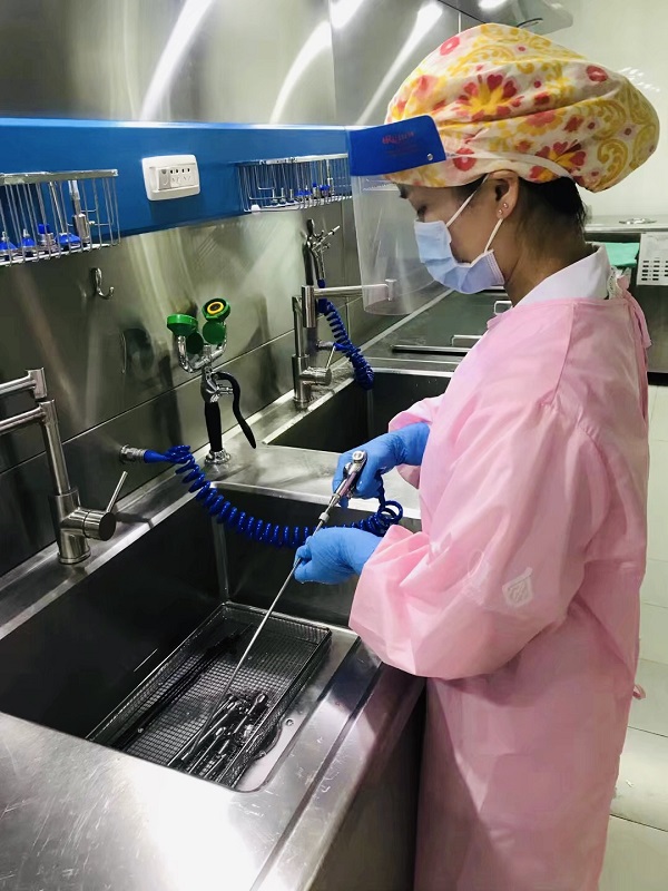 第一站:检查包装灭菌间,工作人员使用带光源放大镜对每件器械进行检查保养,细心装配、双人复核、查数量、规格,保证器械功能完好,表面及关节、齿牙处光洁,无血渍、污渍、水垢等残留物质和锈斑。检查保养完成后,根据GB/T19633的要求进行包装,并选择合适的方法灭菌,由专人负责灭菌效果监测,尤其是外来器械,每批次都要进行物理、化学、生物灭菌监测。