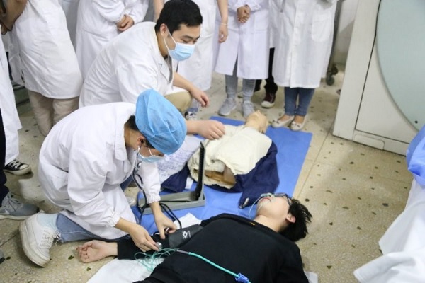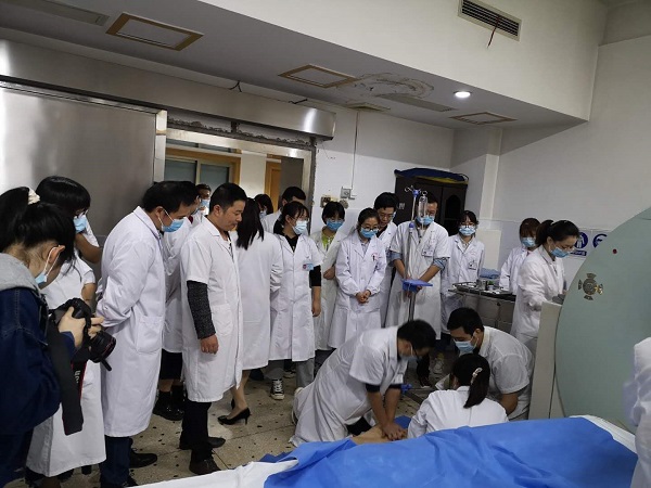 演练之前,放射科汪主任制定抢救应急预案,把科室人员分成四组,模拟日常工作分工,每组人员有技师、护士、医师及实习同学等,要求每组参与施救医护在5分钟内完成呼救、判断、医嘱、救治等所有步骤。