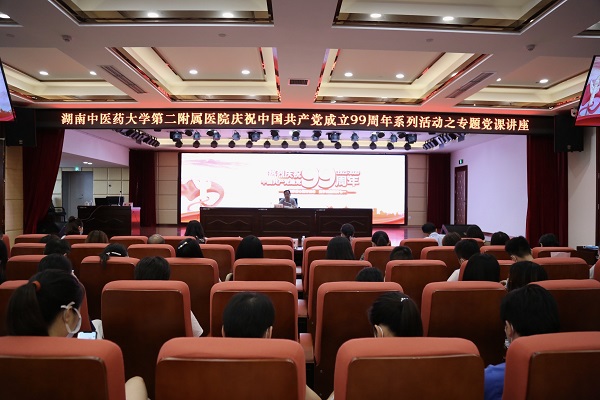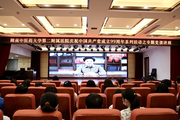 7月1日下午,湖南中医药大学第二附属医院庆祝中国共产党成立99周年系列活动之专题党课讲座在外科楼25楼多功能会议厅隆重举行。医院党委班子成员、全体党员、入党积极分子、发展对象及民主党派代表共200余人参会,会议由党委书记杨声辉主持。