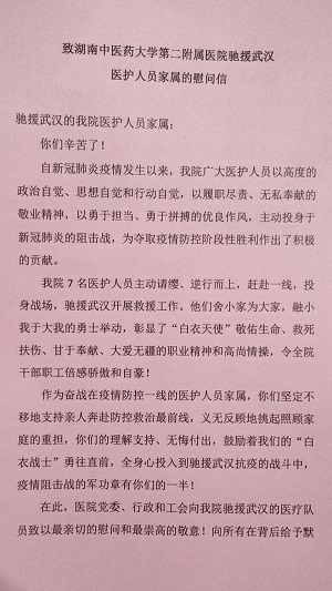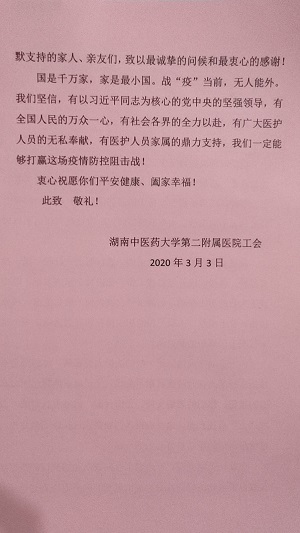一方有难、八方支援,援鄂医疗队员危难时刻挺身而出,充分体现了中医附二人的使命担当和为国为民分忧的高尚品质。医疗队出发后,医院成立了“一对一”帮扶工作小组,通过电话、微信、座谈会、实地走访等多种形式,实时了解前线医护人员和家属的工作和生活情况,及时帮助解决他们的困难。医院将继续深入落实上级有关文件精神,进一步把对医务人员的保护、关心和爱护落到实处,全方位为一线疫情防控医务人员做好后勤保障工作。