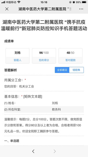 此外,为进一步宣传普及最新的新冠肺炎防控知识并为女职工送上一份惊喜,医院工会组织全院职工同步参与新冠肺炎防控知识手机答题,凡得分80分及以上者均获得100元的奖品一份。