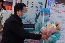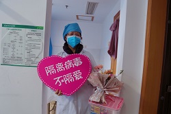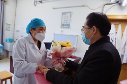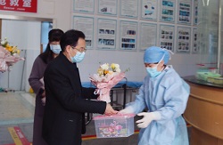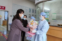 “节日快乐!感谢你们坚守岗位,辛苦大家了!”3月8日上午,医院党委书记杨声辉、党委副书记、纪委书记、工会主席杨彤带领院工会、团委、门诊办、宣统科等相关职能科室负责人一行,来到预检分诊、发热门诊、急诊、儿科、妇科门诊等科室,对一线医护人员进行亲切慰问,为她们送上鲜花和礼盒,感谢她们为疫情防控工作做出的贡献,送去真挚的节日祝福和贴心的节日问候。