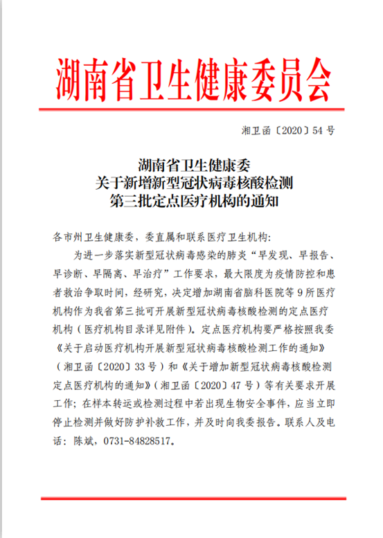 为进一步落实新型冠状病毒感染的肺炎“早发现、早报告、早诊断、早隔离、早治疗”工作要求,最大限度为疫情防控和患者救治争取时间,湖南中医药大学第二附属医院检验科严格按照湖南省卫生健康委员会《关于启动医疗机构开展新型冠状病毒核酸检测工作的通知》和《关于增加新型冠状病毒核酸检测定点医疗机构的通知》等有关要求紧锣密鼓的开展了相关准备工作,并选派了两名思想过硬、工作能力突出的技术骨干李成龙、徐丹赴湘雅医院进行相关进修培训。25日医院获批作为我省第三批可开展新型冠状病毒核酸检测的定点医疗机构(文件附后),将于近期开展新型冠状病毒核酸检测工作。