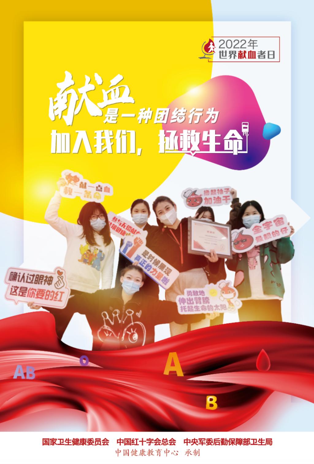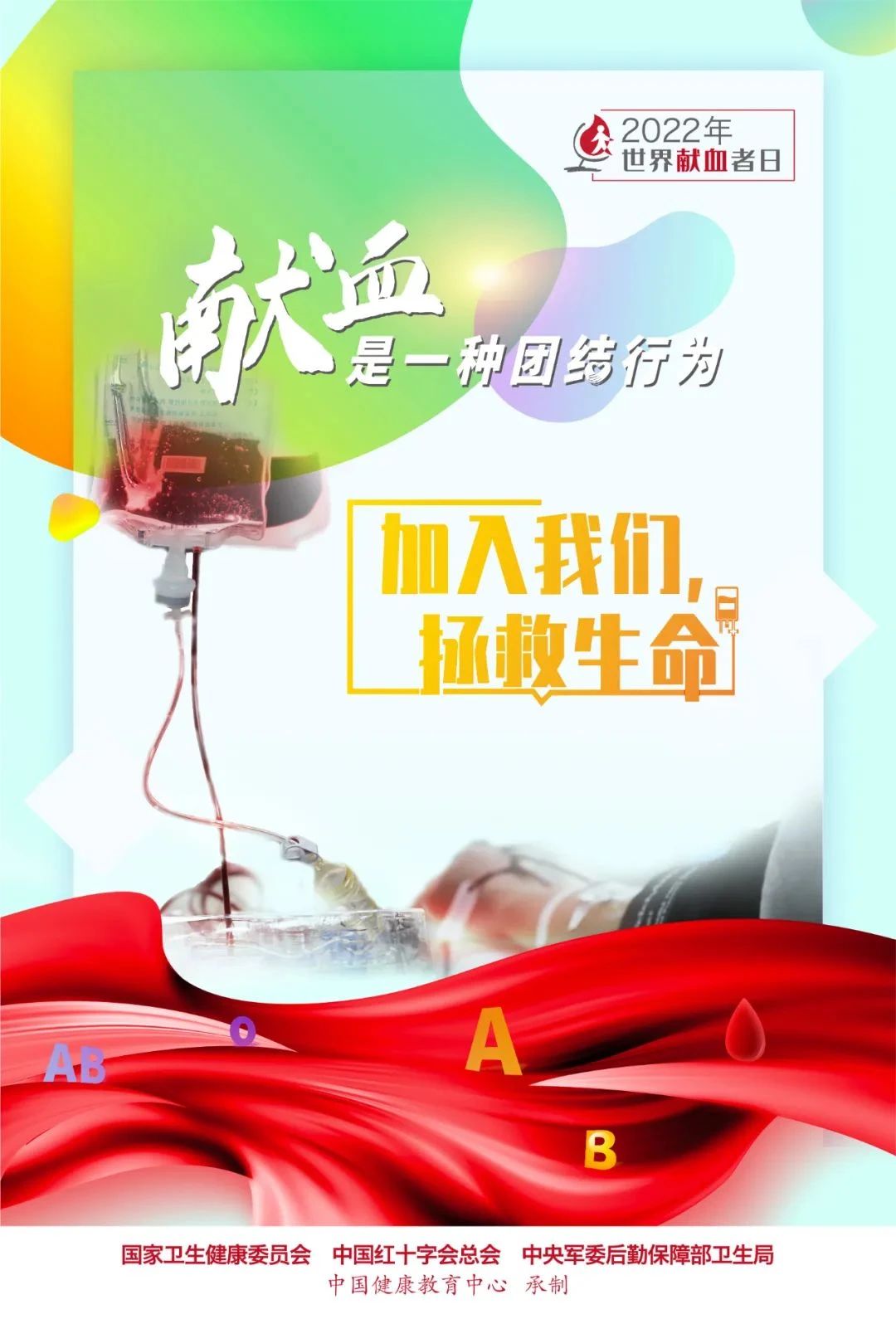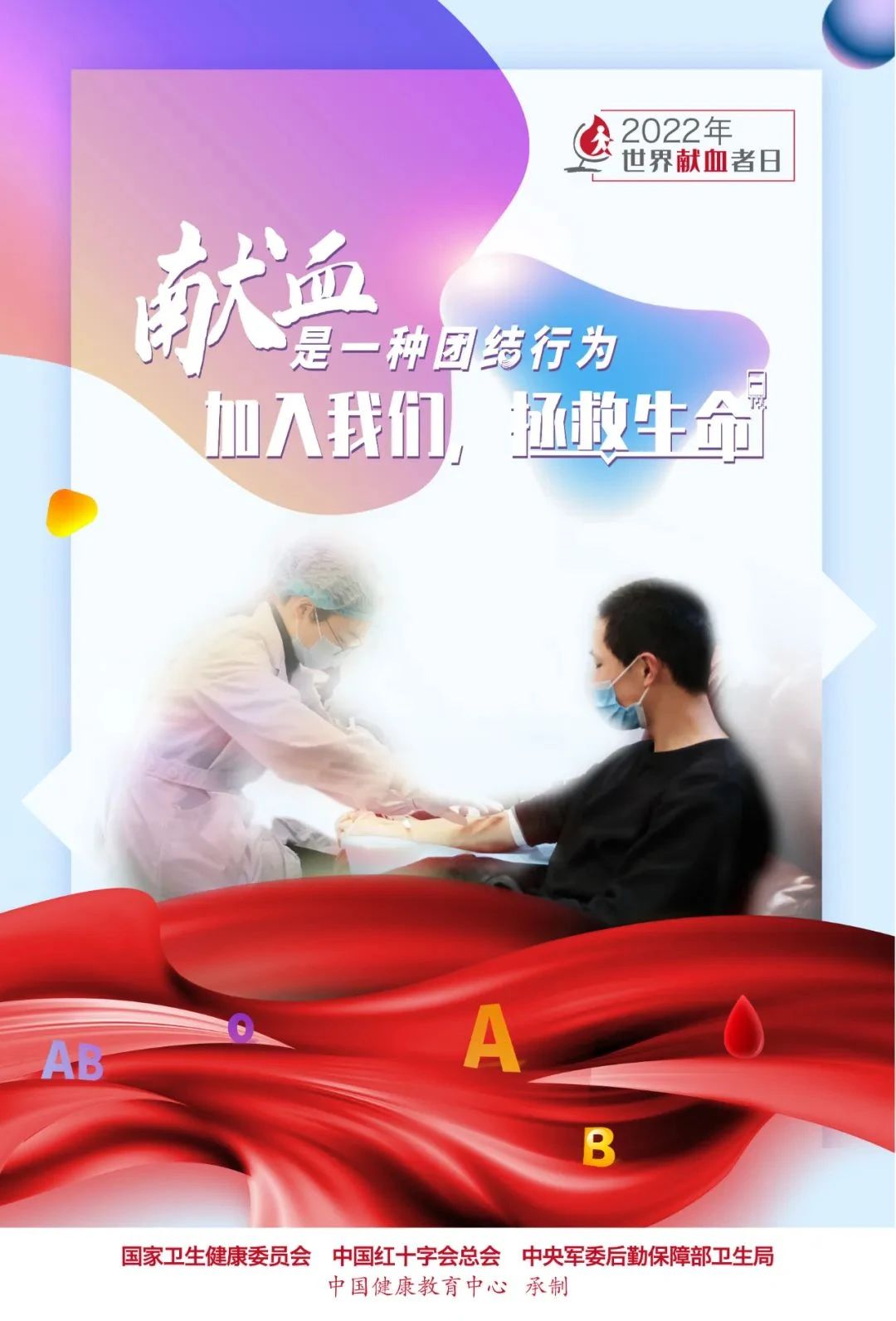2022年6月14日是第19个世界献血者日,主题为“献血是一种团结行为,加入我们,拯救生命”。在国家卫生健康委医政医管局指导下,中国健康教育中心开发制作了无偿献血宣传海报,呼吁更多人参与到无偿献血行动中来。