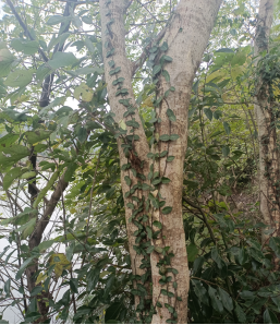 这挂满树的藤,大家有见到过吗?有可能路过很多次哦,这也是一种中药,叫络石藤,为夹竹桃科植物络石Trachelospermum jasminoides (Lindl.)Lem.的干燥带叶藤茎。它的适应性强,南方和北方大部分地区都可以种植,经常是抱着石头或者树木生长,一年四季都是绿油油的,开白色小花,也可用来美化花园和墙面。