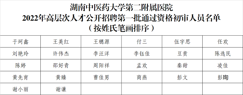 湖南中医药大学第二附属医院2022年高层次人才公开招聘第一批通过资格初审人员名单公示