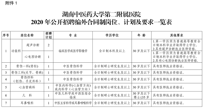 附件:1.湖南中医药大学第二附属医院2020年公开招聘编外合同制岗位、计划及要求一览表