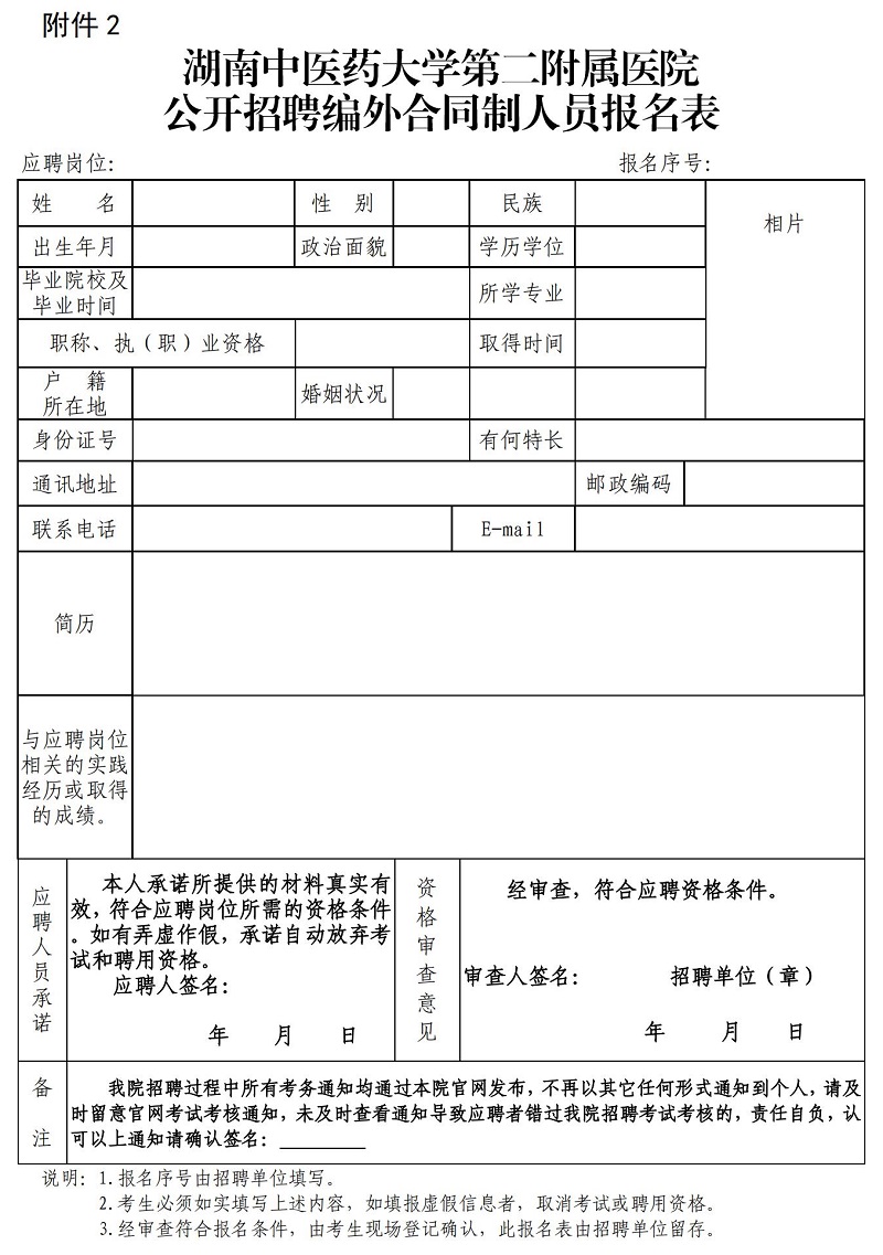 2.湖南中医药大学第二附属医院公开招聘编外合同制人员报名表(点击可下载报名表)
