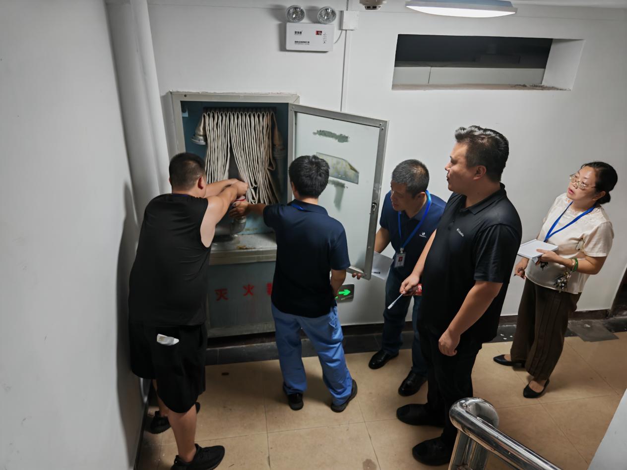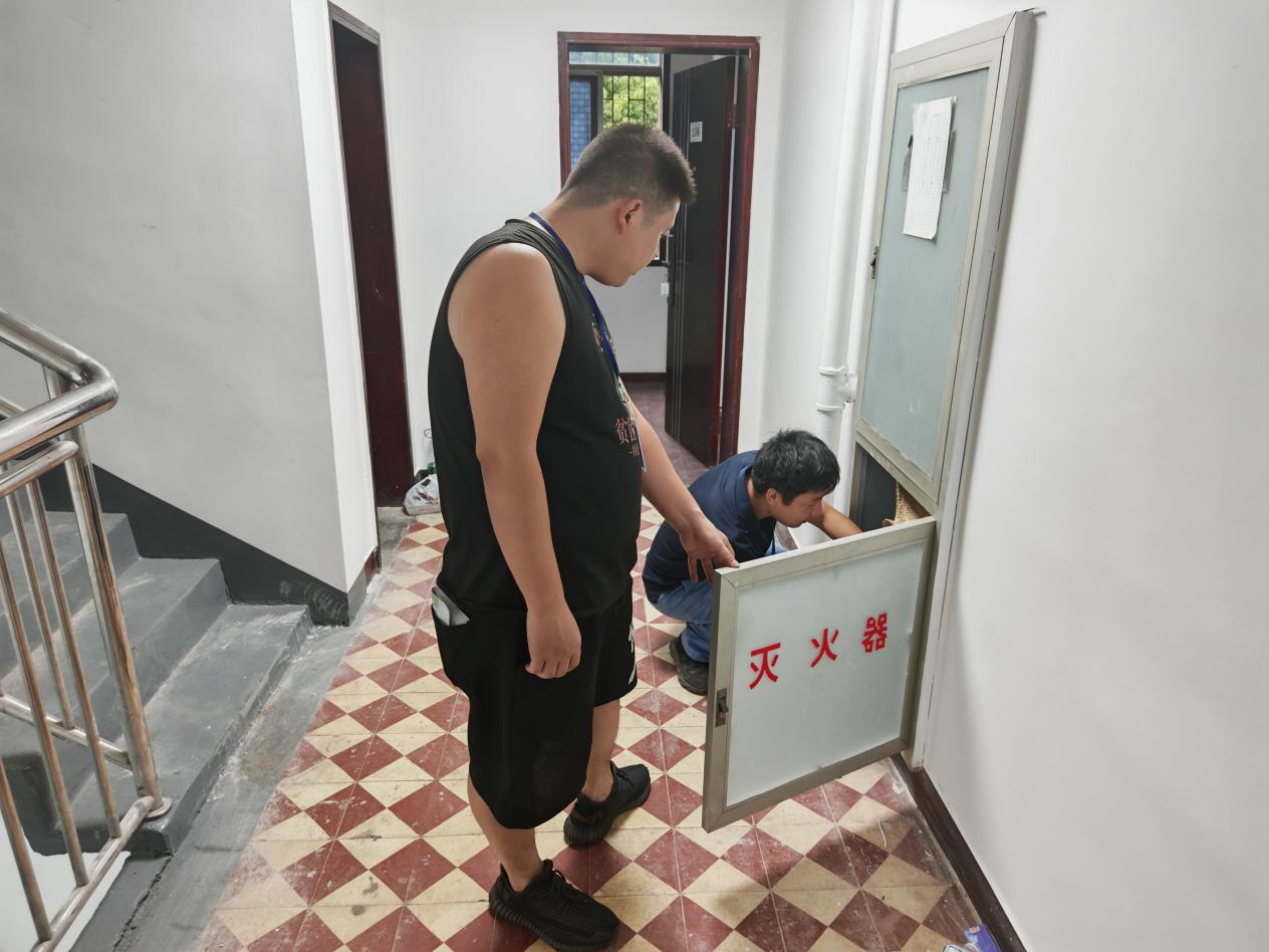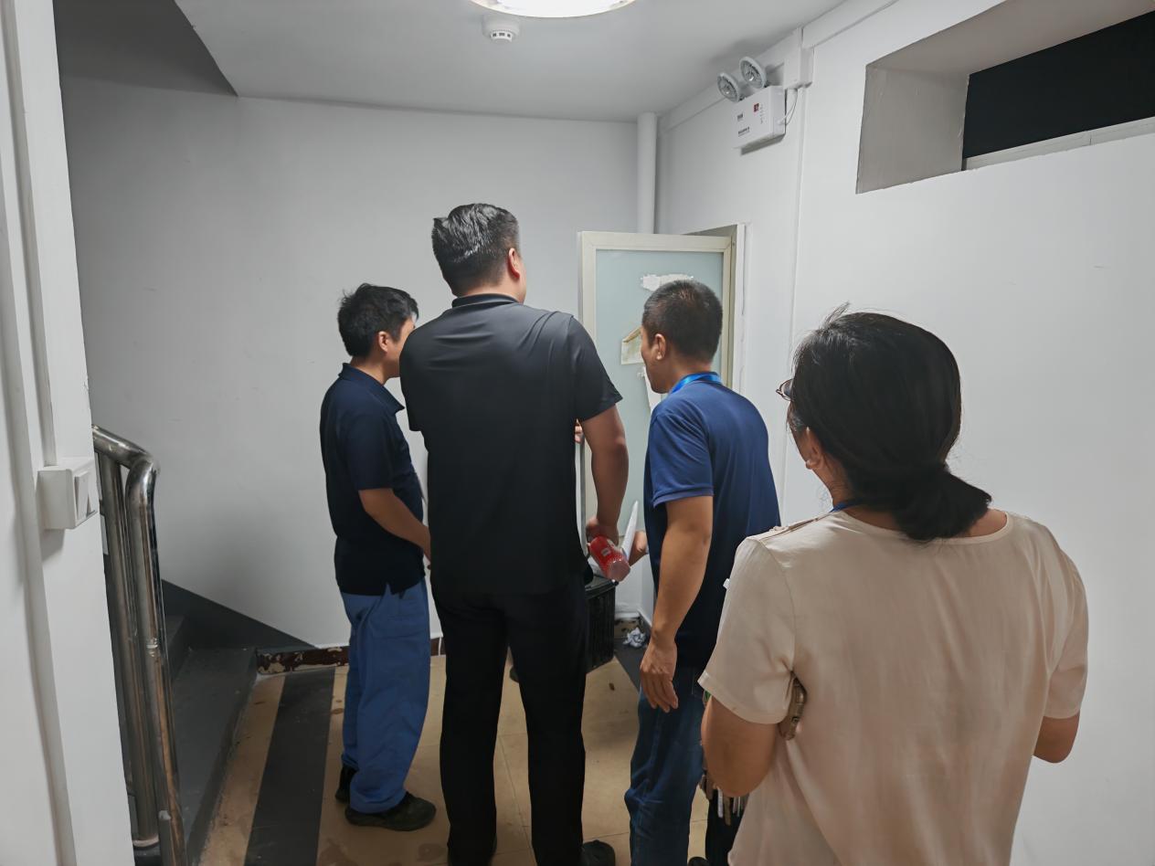 教务部副部长董大立、后勤保障部副部长汪同欢、安全保卫部谢佳及湖南正邦技术服务有限公司技术副经理周杨等一行逐层逐间对宿舍楼的消防设施、用电安全、水管线路、门窗家具等进行了全面细致的排查,重点查看了灭火器、应急照明、疏散通道等关键环节,并对存在的安全隐患进行现场记录与协调处理;同时就宿舍设施维护、环境卫生等方面提出了具体整改要求,强调了消防安全管理的重要性,并对应急流程进行了进一步明确。