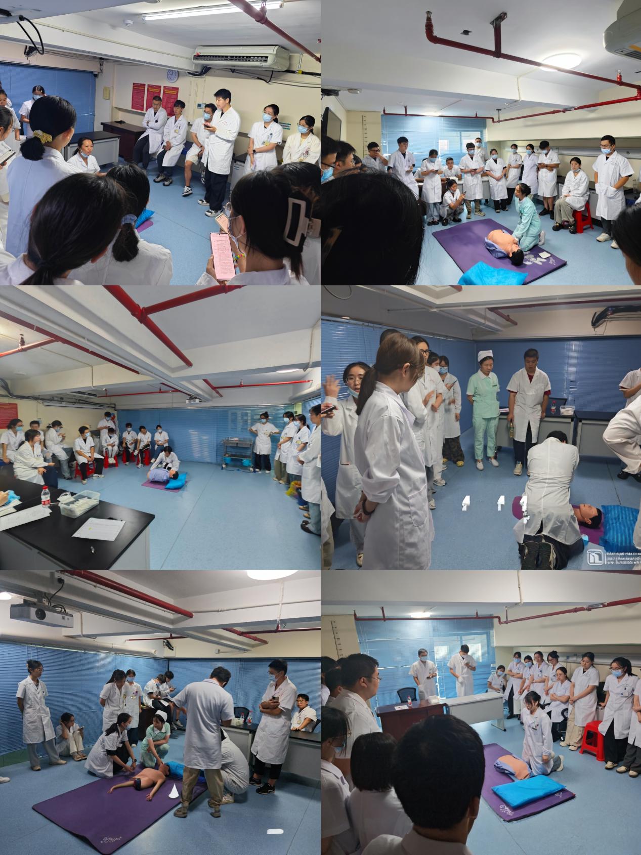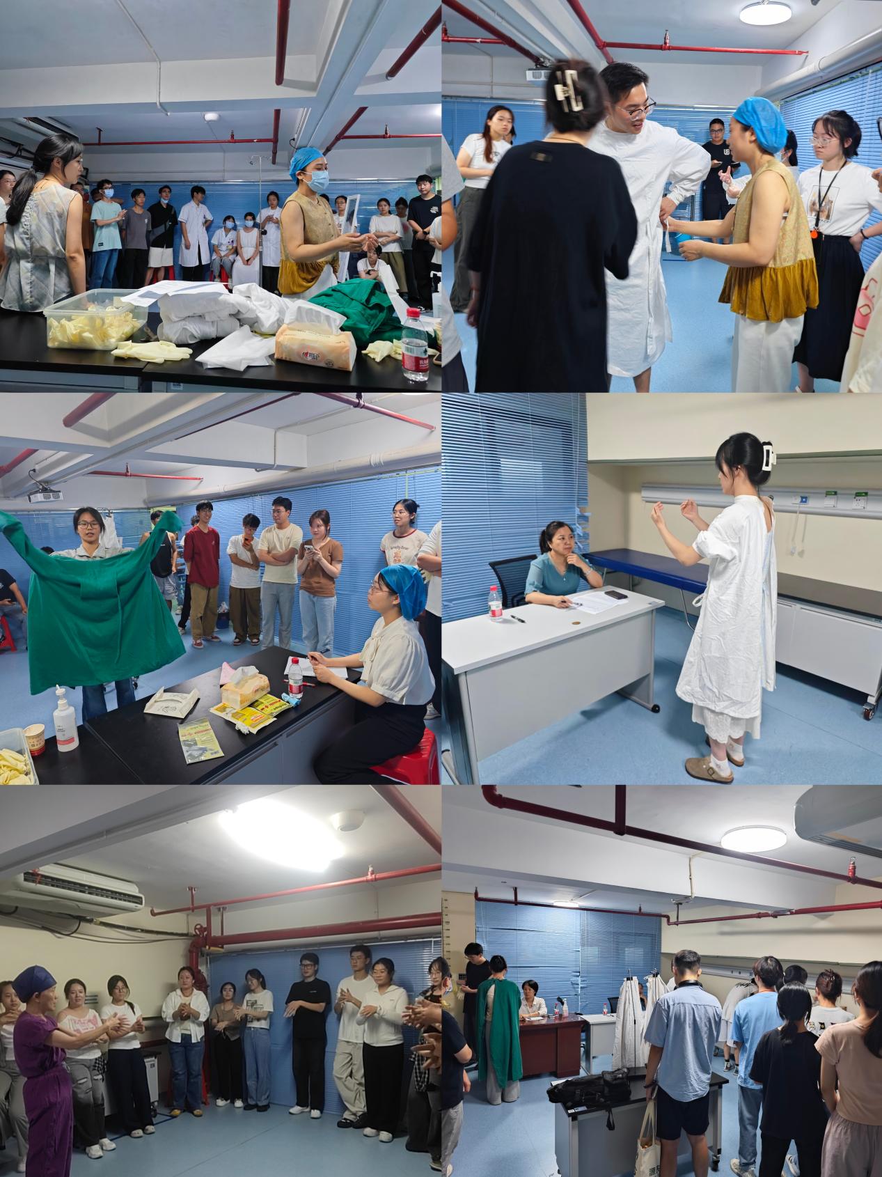 技能培训于9月16日至19日开展,内容包括心肺复苏术、外科洗手、戴无菌手套、穿脱隔离衣及手术衣等基本操作。学员分为六组,在技能中心多个教室同步进行训练。罗柔、吴丹旎、金波、贺琛莹、黄宇香、李洁花、易佳丽、许永红、张宇辉等技能实训老师现场示范、逐一指导,确保每位学员掌握操作要领,并通过现场考核巩固学习成果。