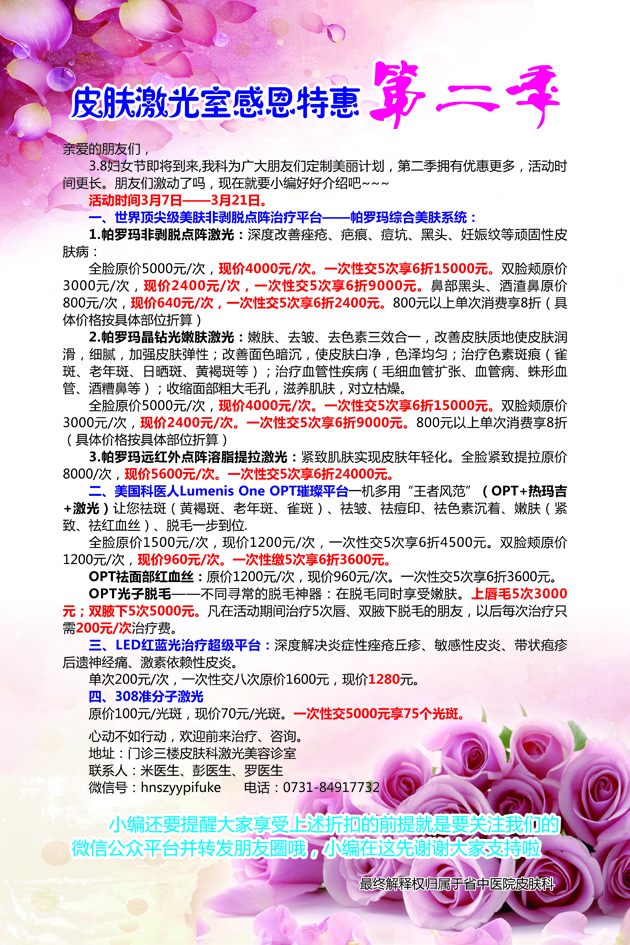 我院端午节期间(2015年6月20日—22日),门诊实行“无假日门诊”,就诊安排如下:1、内科、妇科、皮肤科、肛肠科、疼痛科、小儿科全天开放;眼科、耳鼻喉科、针灸中风科、骨伤科、普通外科、泌尿外科每天上午开放;脊柱外科6月20日上午开放、6月22日全天开放;口腔科6月20日上午开放。咨询电话:0731—84917810。2、急诊24小时开放,咨询电话:0…