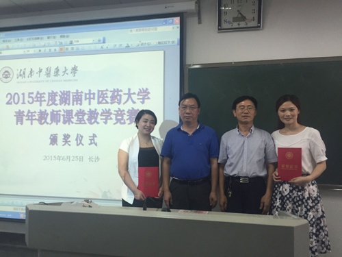 2015年6月25日,“2015年度湖南中医药大学青年教师课堂教学竞赛”在湖南中医药大学接待中心研究生专用教室举行。经过紧张精彩的比赛,现场专家评审打分,我院彭美瑶、张晶晶两位教师在本次教学竞赛中分别获得一等奖和...